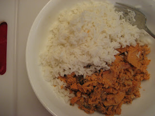 Then, it's a simple matter to layer the salmon-rice mix -- not forgetting to add the cooked onions and green pepper to this -- into the casserole alternately with the sauce.